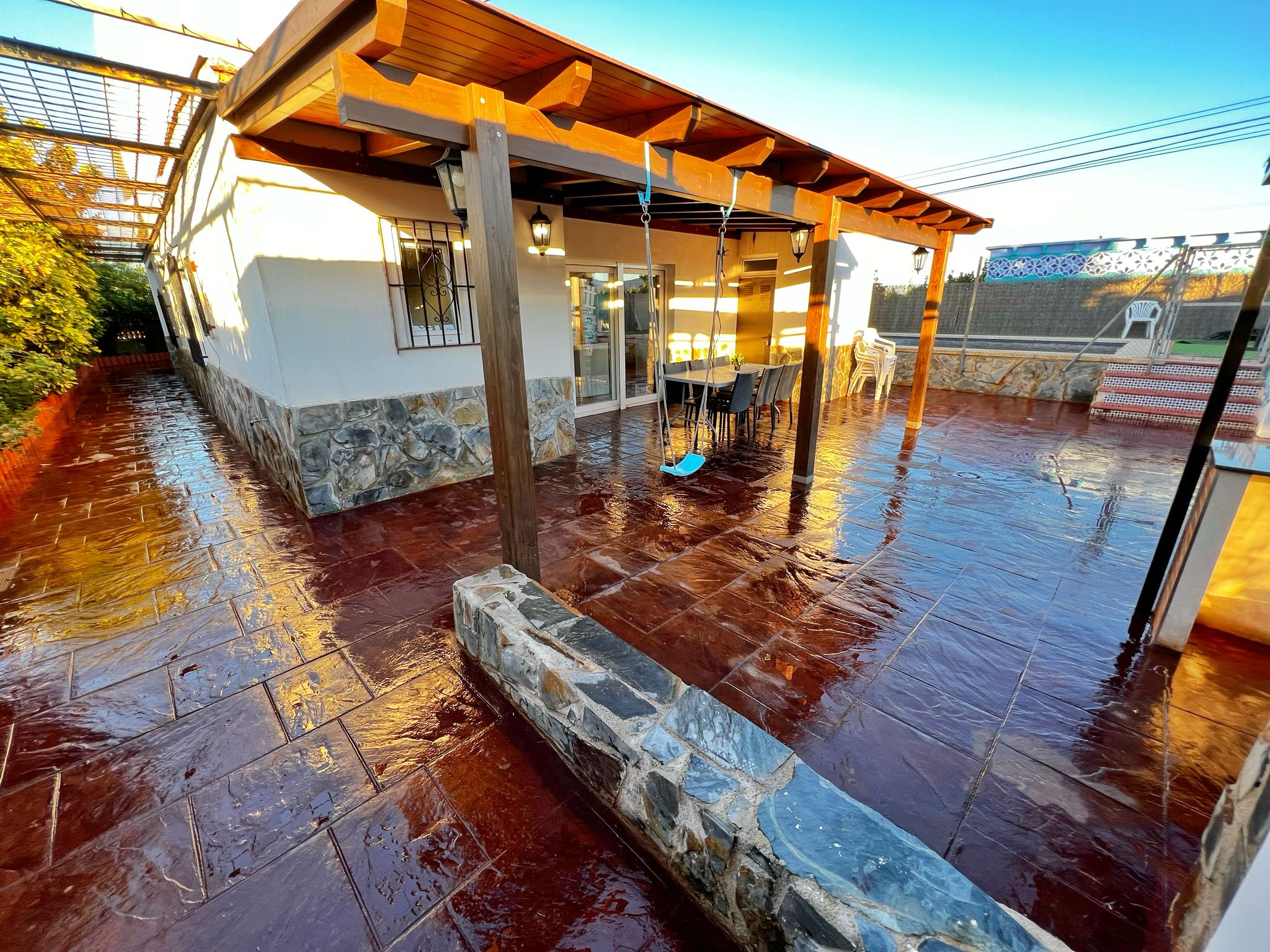En el exterior de la vivienda encontramos en una parte de la casa el acceso para los vehículos y espacio para jugar, mientras que al otro lado encontramos la zona de barbacoa, terraza exterior cubierta, piscina y trastero.